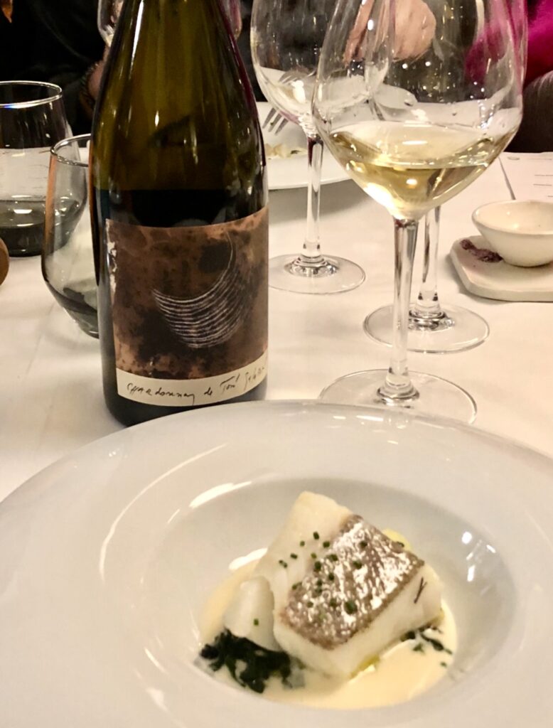 Bacalao a baja temperatura con coliflor, espinacas, pasas, piñones y crema de queso mahonés madurado y maridado con Chardonnay 2021.