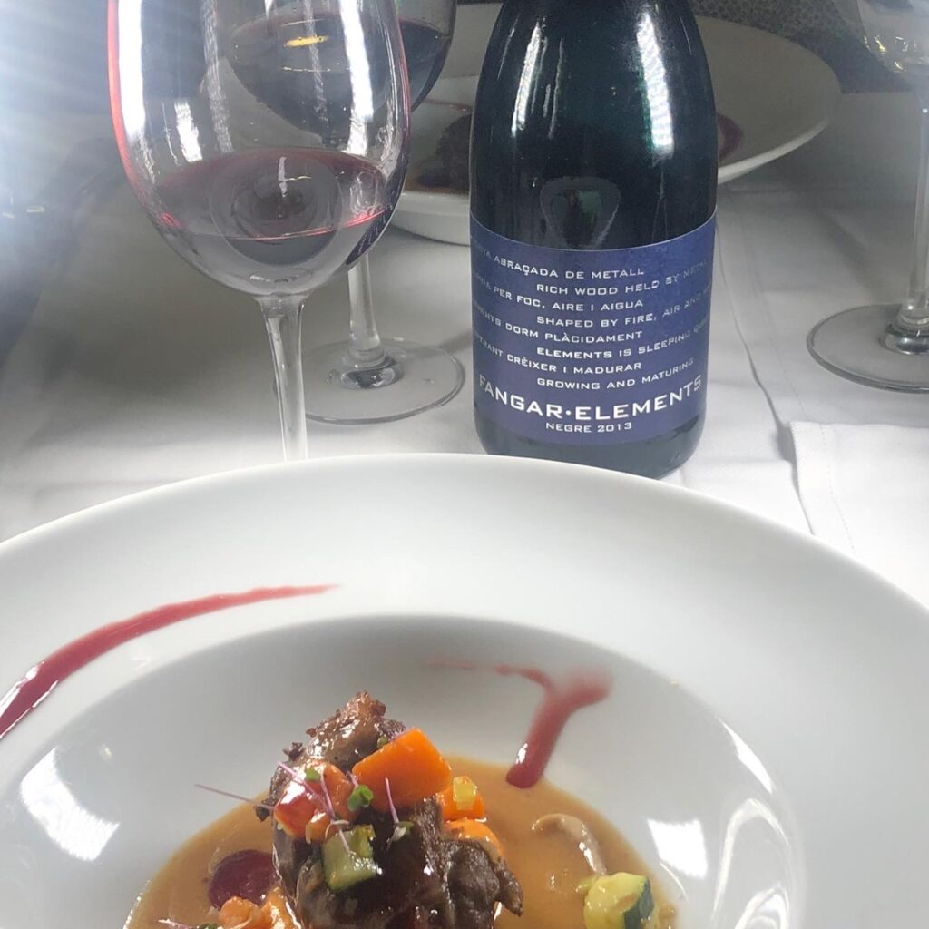 4. Mejillas de cerdo acompañada de los primeros boniatos de la temporada con una salsa de vino tinto y verduras maridado con Elements 2013 BIO. 24 meses de crianza en barricas nuevas de roble francés y posteriormente embotellado. Cabernet, callet y manto negro. 14,5% de grado alcohólico. Vino de una extraordinaria suavidad. Destaca por sus taninos dulces.
