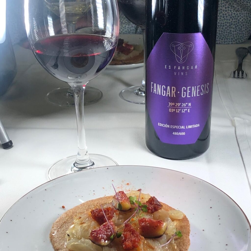 2. Torta de higos con sobrasada. Coca hecha con los últimos higos de la temporada con sobrasada de cerdo negro sobre una base de pasta hecha con harina de «xeixa» maridado con el vino Génesis 2021, monovarietal joven de cabernet sauvignon. Fermentado en depósitos de acero. Es uno de los pocos vinos tintos jóvenes del Pla i Llevant. Habitualmente todos los negros pasan por bota.