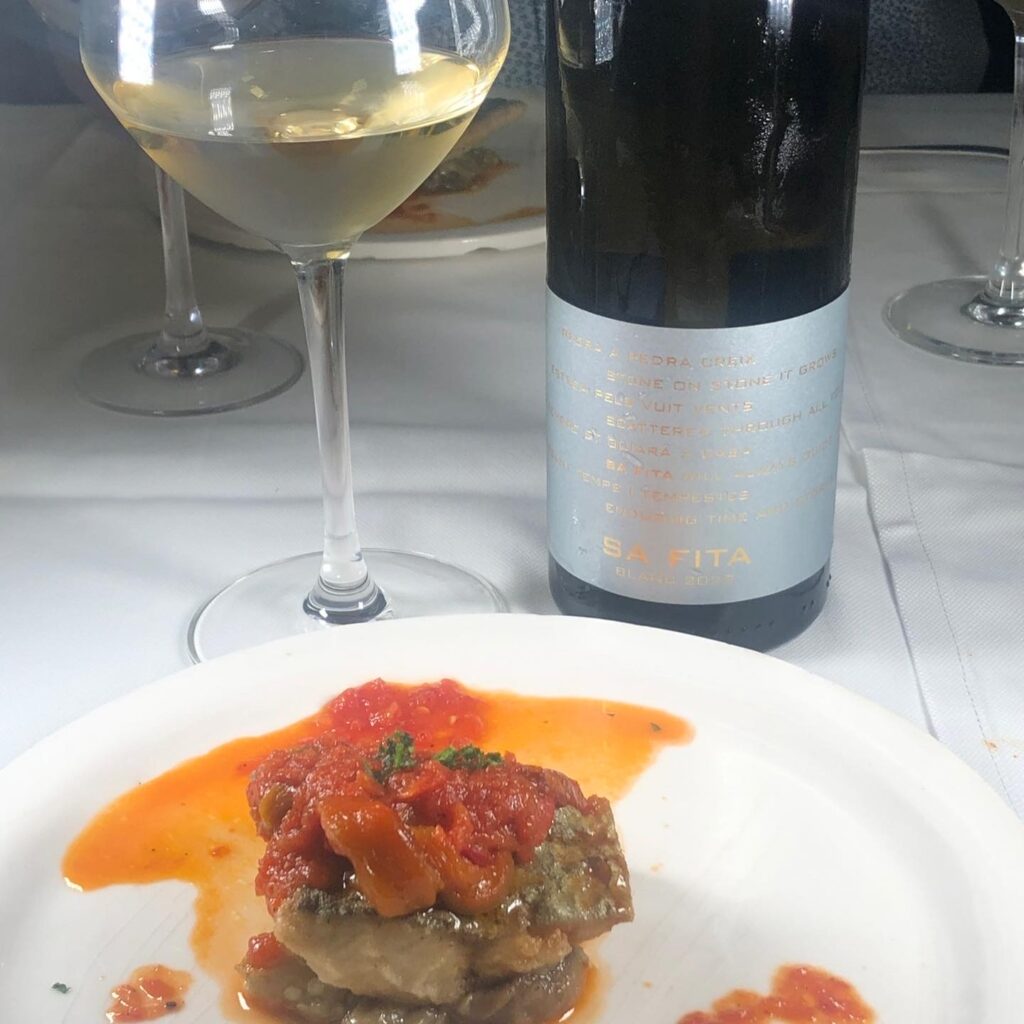3. Lampuga que ahora es el pescado de la temporada con escalivada hecha de pimientas, tomate y berenjena maridado con Sa Fita BIO, blanco 2019. 13,5% de grado alcohólico. Chardonnay, viognier, moscatel. Fermentación en depósitos de acero.