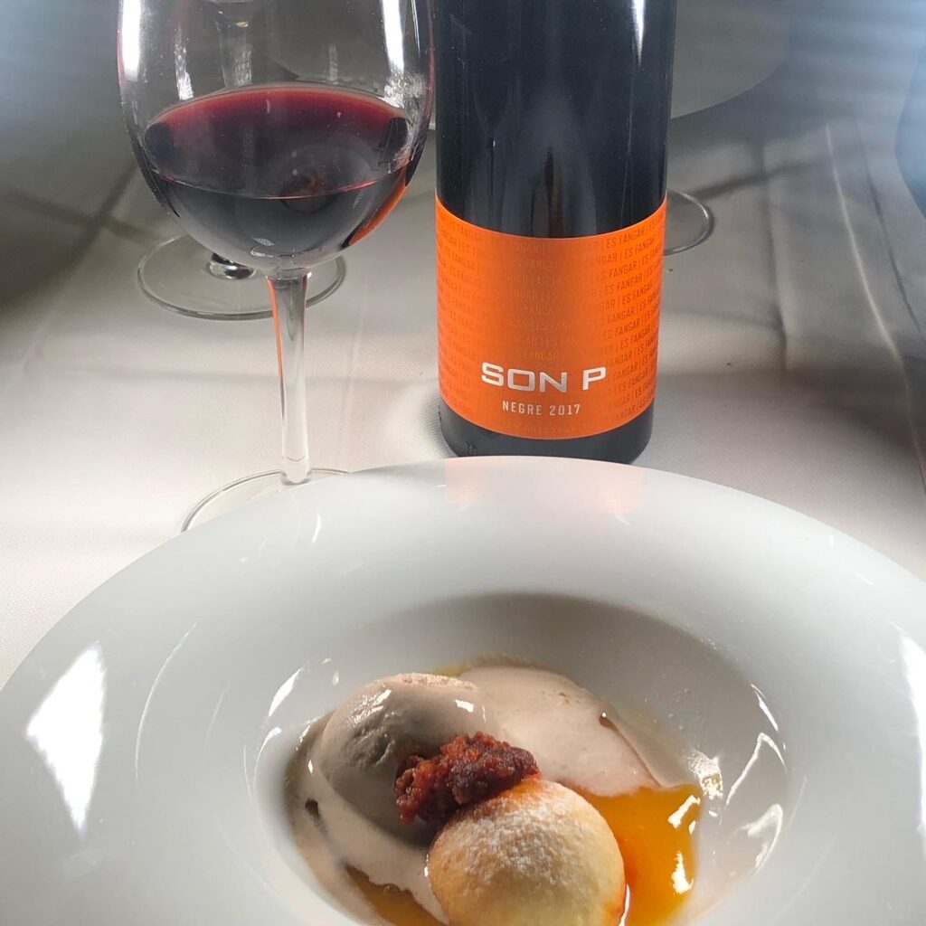 5. Para terminar un postre que han inventado este verano: coca de patata con albaricoque, que en este caso está sustituido por caqui, helado de algarroba y sobrasada con Son P 2017. Callet, cabernet, merlot y manto negro. Fermentación hecha en barricas nuevas de roble americano durante 8 meses y posterior embotellado. 14,5% de grado alcohólico.