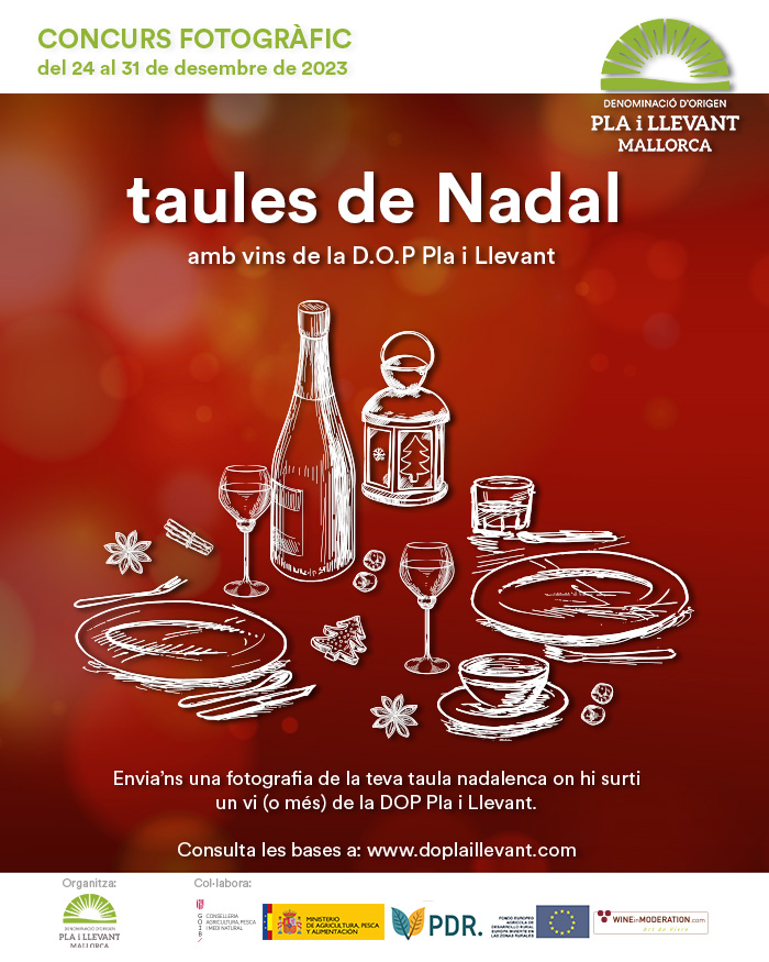Por este motivo, convocamos el concurso de «Taules de Nadal». Podéis enviar la foto de vuestra mesa, dónde salga una botella (o más) de vino o espumoso de cualquier bodega de la denominación de origen Pla i Llevant, al móvil 650 352 095, indicando vuestro nombre y teléfono. A cada foto se le asignará un número para poder participar en el sorteo de cuatro lotes de vino de dos botellas de vinos de las bodegas de la DO Pla i Llevant. Las fotos se publicaran en la web del Pla i Llevant (www.doplaillevant.com). A continuación podréis consultar las bases completas del concurso. Se podrán presentar fotos entre el 24 de diciembre a les 20h y el 31 de diciembre a les 00h. El martes, 2 de enero, se hará un sorteo virtual mediante la plataforma www.sortea2.com/sorteos para elegir lo cuatro ganadores de los cuatro lotes de vino.