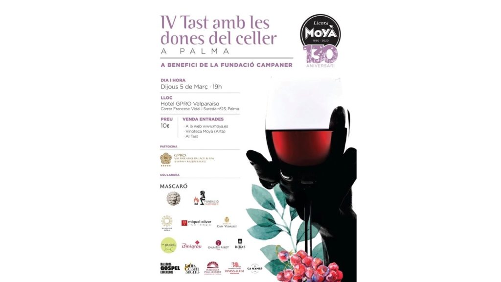 Nueva cita en el mundo del vino. El próximo jueves, 5 de marzo, a partir de las 19 h, en el Hotel Valparaíso cita para catar los vinos elaborados por mujeres en diversas bodegas de las islas: Miquel Oliver, Mesquida Mora, Ribas, Can Majoral, Can Vidalet, Galmés i Ribot, Binigrau. Entrada 10 euros. A beneficio de la Fundació Campaner.