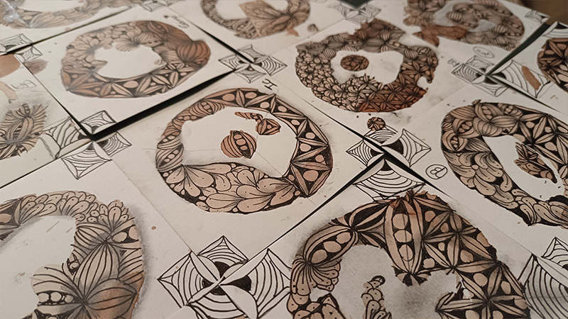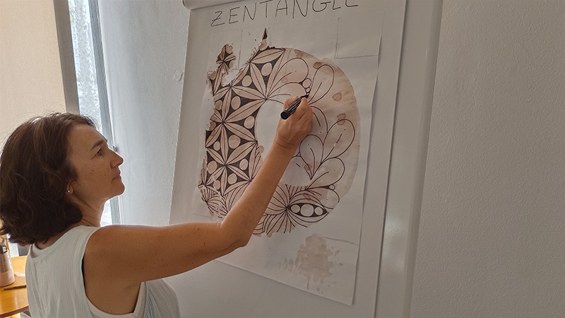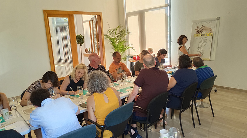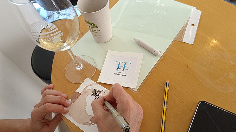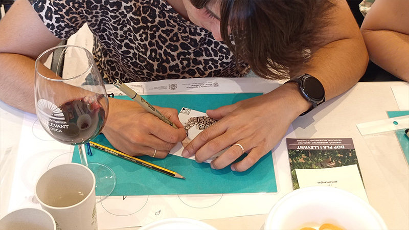 El taller fue conducido por la artista Tania Ferriol, quien introdujo a los participantes en la técnica del método Zentangle, una práctica de dibujo meditativo que fomenta la relajación y la creatividad. Durante la sesión, los asistentes trabajaron sobre manchas de vino tinto, creando composiciones únicas y personales, y descubriendo el artista que todos llevamos dentro, en un ambiente relajado e inspirador.